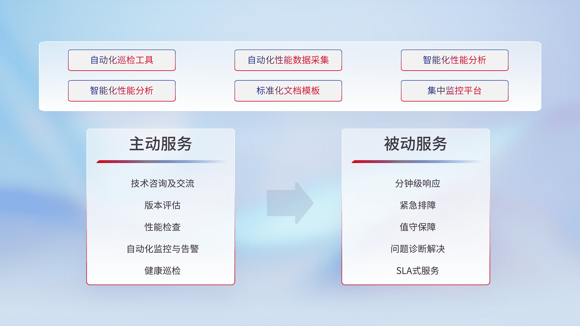 智能化工具和标准化文档,,,保障服务质量,,提供主动服务(包含技术咨询、、版本评估、、、、性能检查、、、自动化监控与告警、、、、健康巡检)和被动服务包含(分钟级响应、、、、紧急排障、、、、值守保障、、、、问题诊断解决、、、、SLA服务)。。